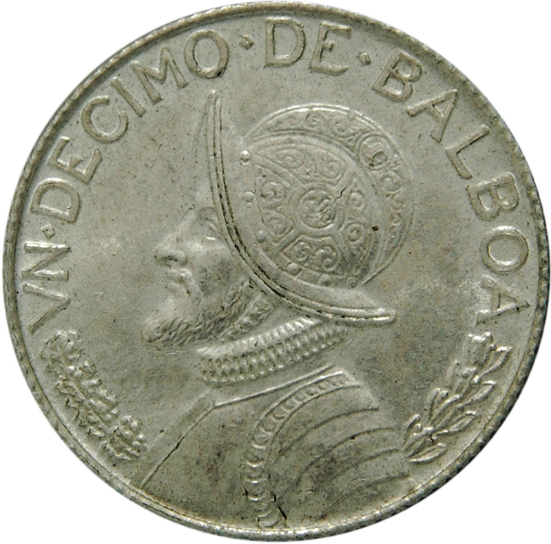 Опис: Броньований бюст з шоломом Васко Нуньєса де Бальбоа, звернений вліво, оточений номіналом у літерах та вінком, що торкається нижнього краю.