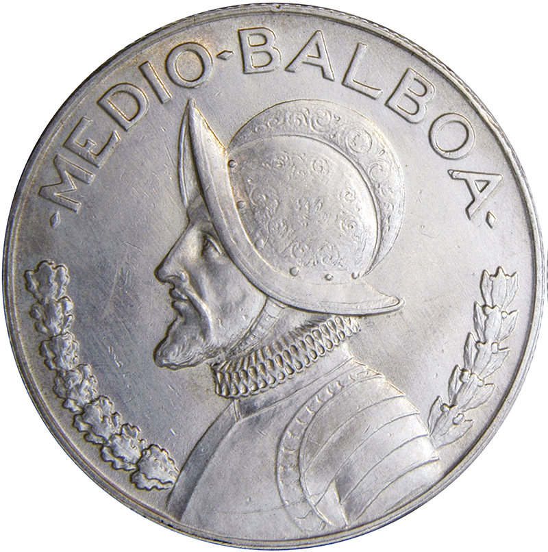 Опис: Броньований бюст у шоломі Васко Нуньєса де Бальбоа, іспанця, першого європейця, який перетнув перешийок і дістався Тихого океану суходолом, а також першовідкривача архіпелагу Перлас (1513), звернений вліво, оточений номіналом у літерах і вінком, бюст торкається нижнього краю.