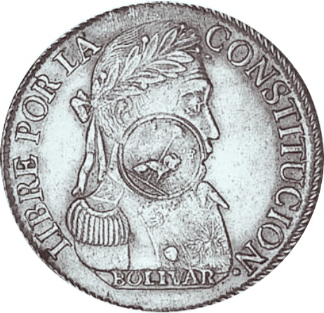 Опис: Голова Сімона Болівара в лавровому вінку, звернена вправо, з контрмаркою у вигляді круглого штампа із зображенням сидячого лева під капелюхом Свободи на жезлі, що розділяє дату 1868 рік (один із двох національних гербів, який називається «Sello de Hacienda»).