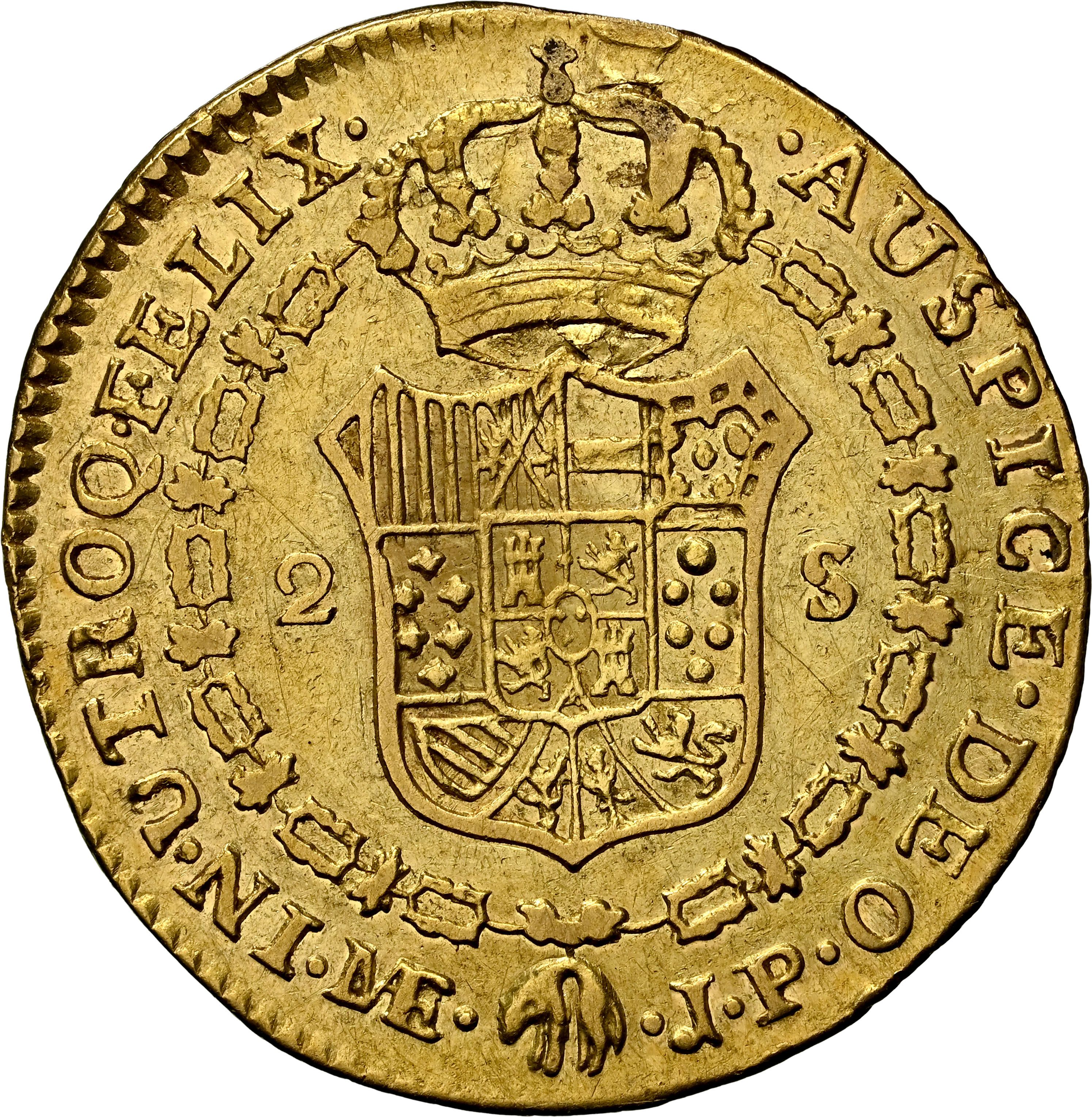 Опис: Коронований герб Іспанії, що розділяє номінал; стилізований ланцюг навколо, напис навколо, поруч з краєм; знак монетного двору та ініціали пробірника внизу.