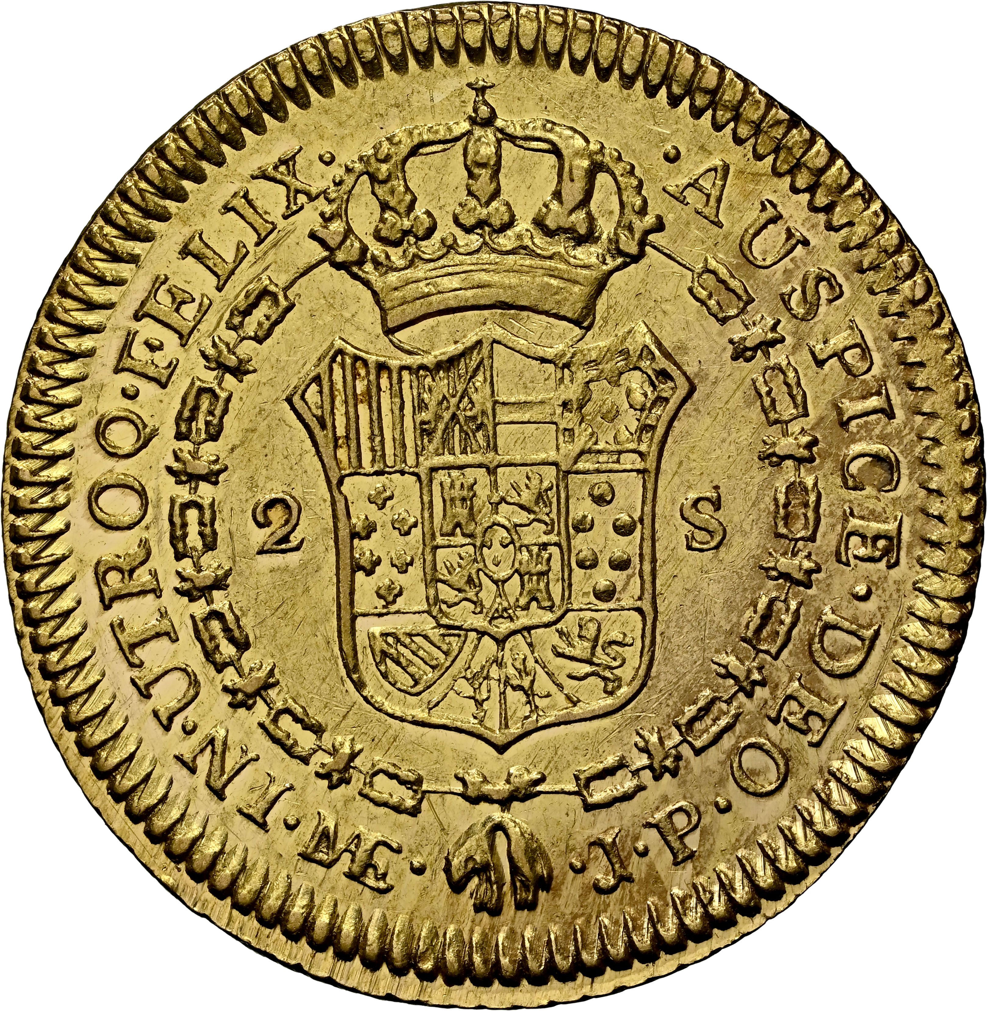 Опис: Коронований герб Іспанії, що розділяє номінал; стилізований ланцюг навколо, напис навколо, поруч з краєм; знак монетного двору та ініціали пробірника внизу.