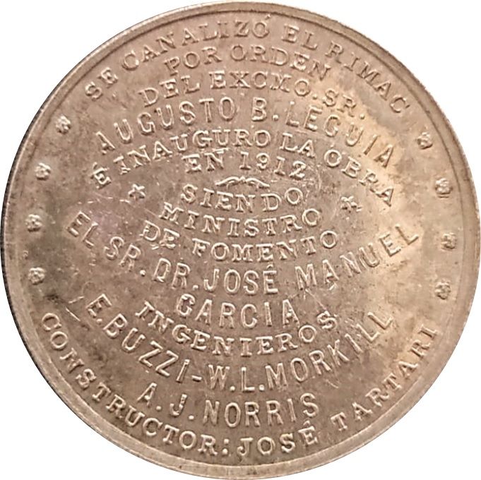 Опис: На аверсі зображено портрет колишнього президента (1908-1912) Республіки Перу Аугусто Б. Легія. На реверсі розміщено напис, присвячений будівництву каналу Рімак та особам, які брали участь у цьому проекті.