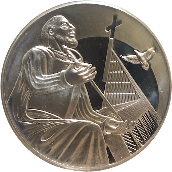 Опис: Гравірування засновника Атенео зліва, який дивиться вгору на шпиль Атенео праворуч. Гравірування голуба, що летить над шпилем у верхньому правому куті.