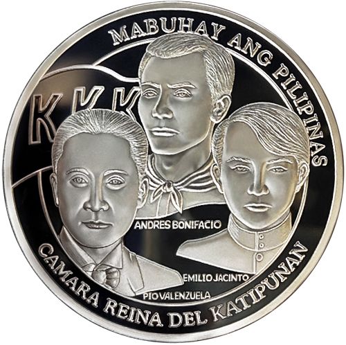 Опис: Портрети тріумвірату Катіпунану: Андрес Боніфасіо (вгорі), Піо Валенсуела (ліворуч) та Еміліо Хасінто (праворуч), з прапором Катіпунану ліворуч.
