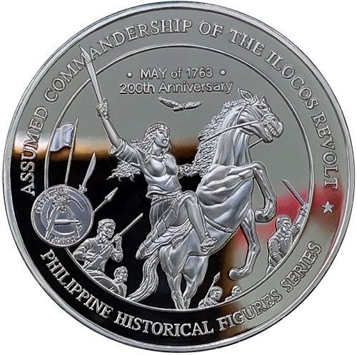 Опис: Культова поза Габріели Сіланг, яка атакує і їде верхи на коні, як зображено на багатьох її статуях по всій Філіппінах. Її армія навколо неї атакує і слідує за нею. Птах зверху.