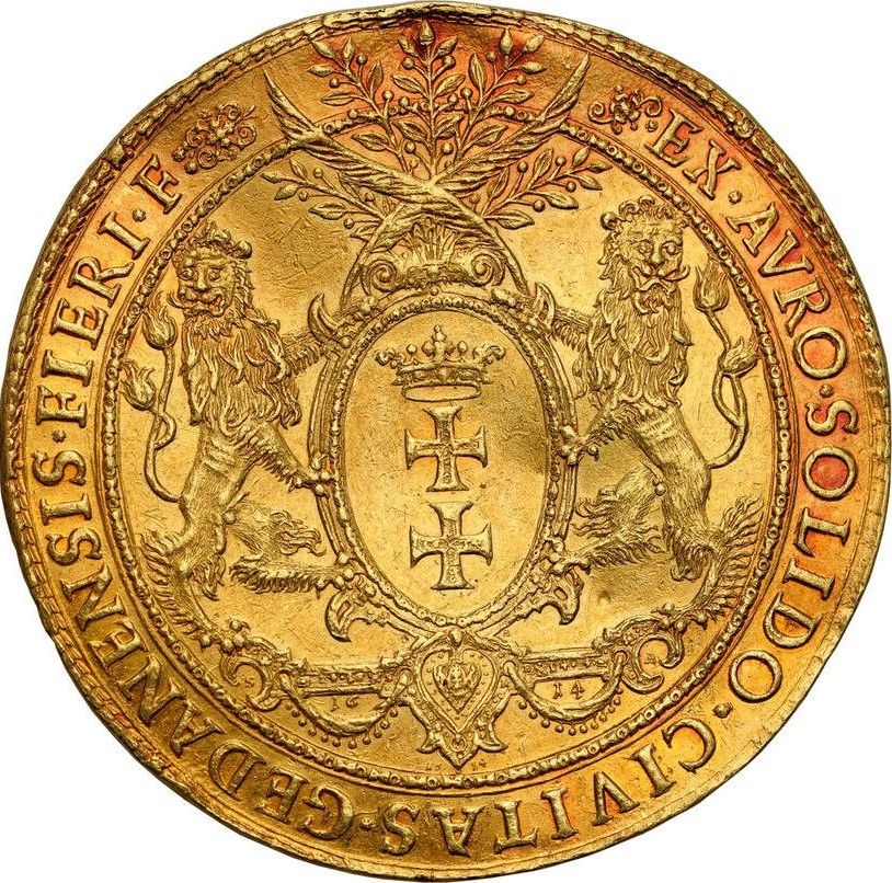 Опис: Овальні гербові щити міста Данцига, підтримані двома левами, що стоять обличчям один до одного, і увінчані гілками пальми та оливи. Розділена дата в лопастях картуша нижче.