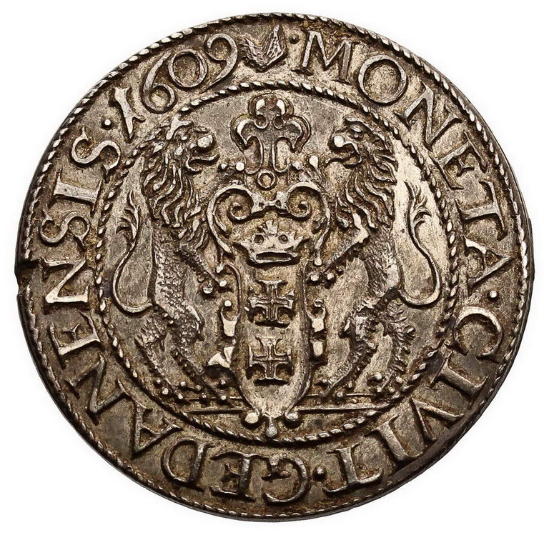 Опис: Коронований герб міста Гданська на вигнутому щиті, увінчаному хрестом, підтримується двома левами, що стоять обличчям один до одного. Дата в кінці легенди.