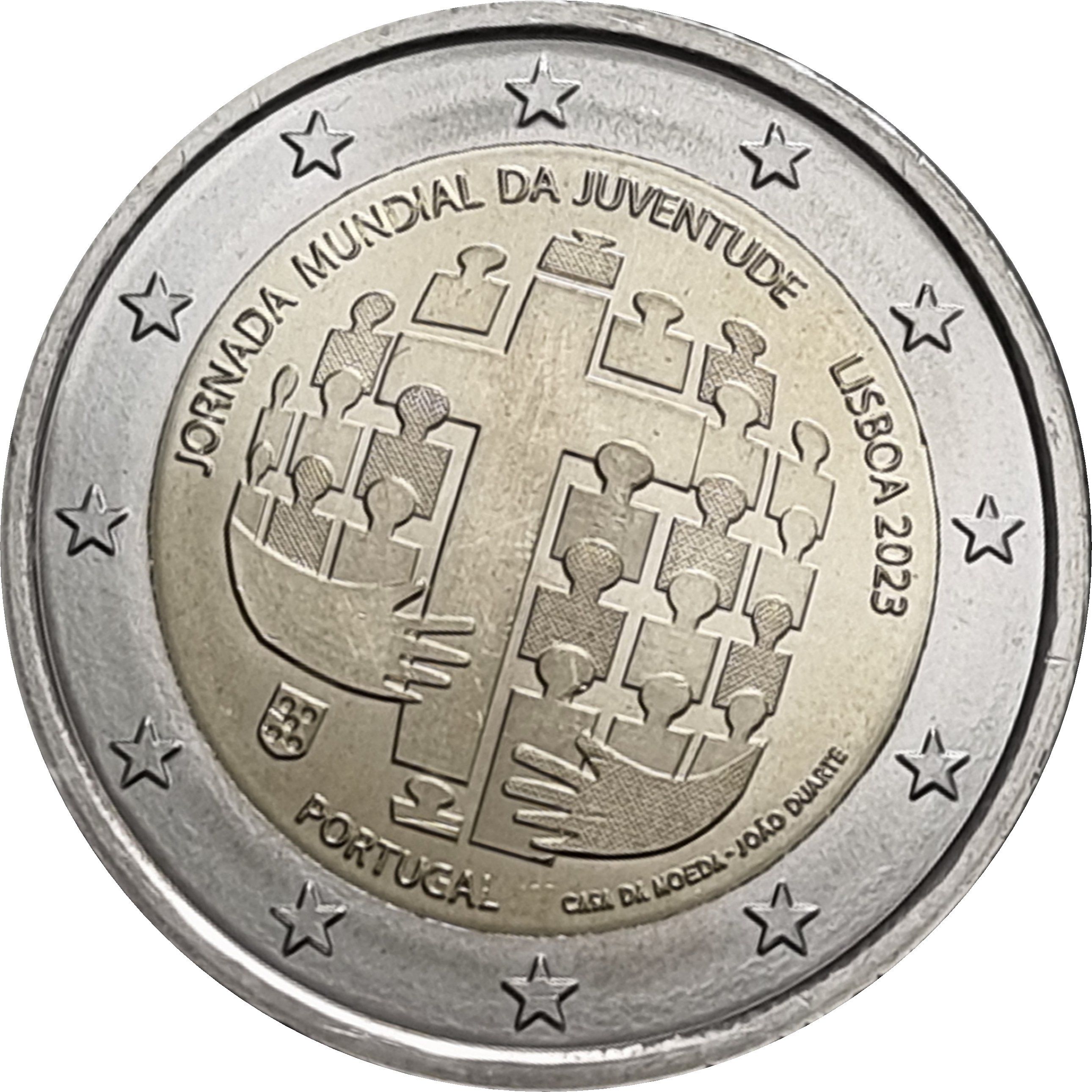 Опис: У верхньому кільці написано «Jornada Mundial da Juventude Lisboa 2023». У нижньому лівому куті зображено португальський герб. У центрі написано «Portugal». У правому куті написано «Casa da Moeda» та вказано ім'я автора João Duarte. У центрі монети зображено хрест паломника. Кілька фігур нагадують форму земної кулі. Внизу зображено дві руки, що обіймають фігури. На зовнішньому кільці монети зображено 12 зірок європейського прапора.