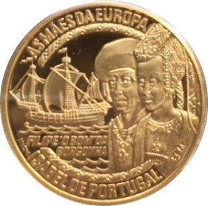 Опис: Ізабела Португальська та Філіп «Доброзичливий» Бургундський як пара в паралельному профілі праворуч. По центру горизонтально ліворуч — вітрильник «Каравелла», що пливе ліворуч по стилізованих хвилях. Між написом на краю та зображеннями в центрі проходить кордон, прикрашений в архітектурному стилі мануеліно.
