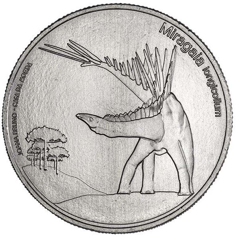 Опис: У центрі — динозавр, що дивиться вперед, з головою та хвостом, повернутими вправо; внизу — силует землі та гай; по лівому краю — ім'я автора та слова «Casa da Moeda»; по правому краю — наукова назва виду Miragaia longicollum.