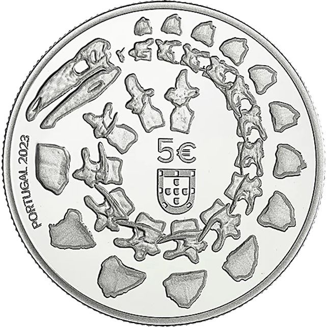 Опис: Зображення скам'янілості динозавра у формі спіралі; у центрі — номінал та герб Португалії; по лівому краю — слова «Portugal» та «2023».