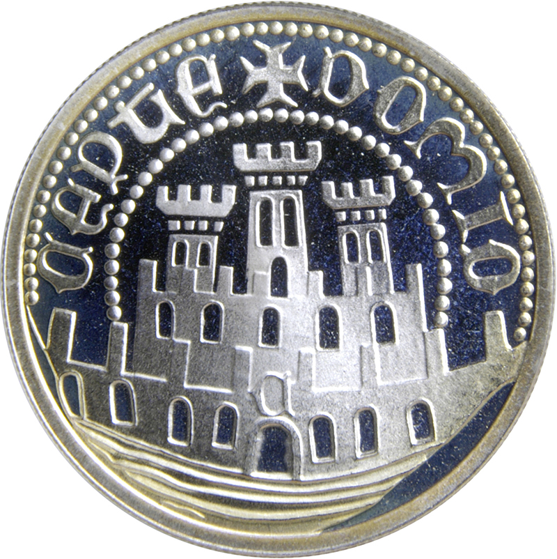 Опис: Репліка реверсу золотої монети «Meio-Escudo» Афонсу V Португальського, на якій зображено нещодавно завойовані стіни міста Сеута (Північна Африка).