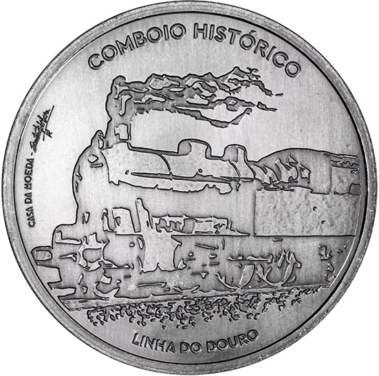 Створена художником-пластиком Жозе Санта-Барбарою, ця монета зображує емблематичний паровоз 0186 Португальських залізниць, який і сьогодні продовжує курсувати історичною лінією Дору між станціями Регуа і Туа, на радість туристам і любителям залізниць.