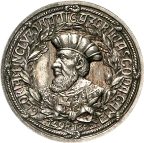 Опис: Бюст Васко да Гами ліворуч у лавровому вінку, навколо напис із датою внизу.