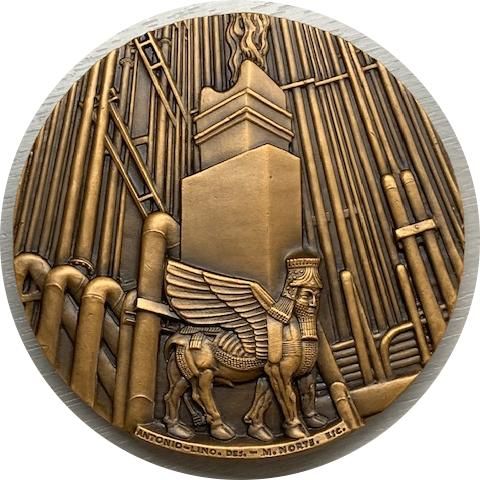 Опис: На передньому плані зображено крилатого лева з уявною головою стародавнього правителя Вавилону, за ним — димар печі того ж періоду, а на задньому плані — пейзаж з трубами, що символізують сучасний нафтопереробний завод, який займає всю медаль.