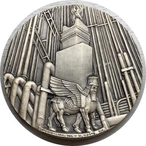 Опис: На передньому плані зображено крилатого лева з уявною головою стародавнього правителя Вавилону, за ним — димар печі того ж періоду, а на задньому плані — пейзаж з трубами, що символізують сучасний нафтопереробний завод, який займає всю медаль.