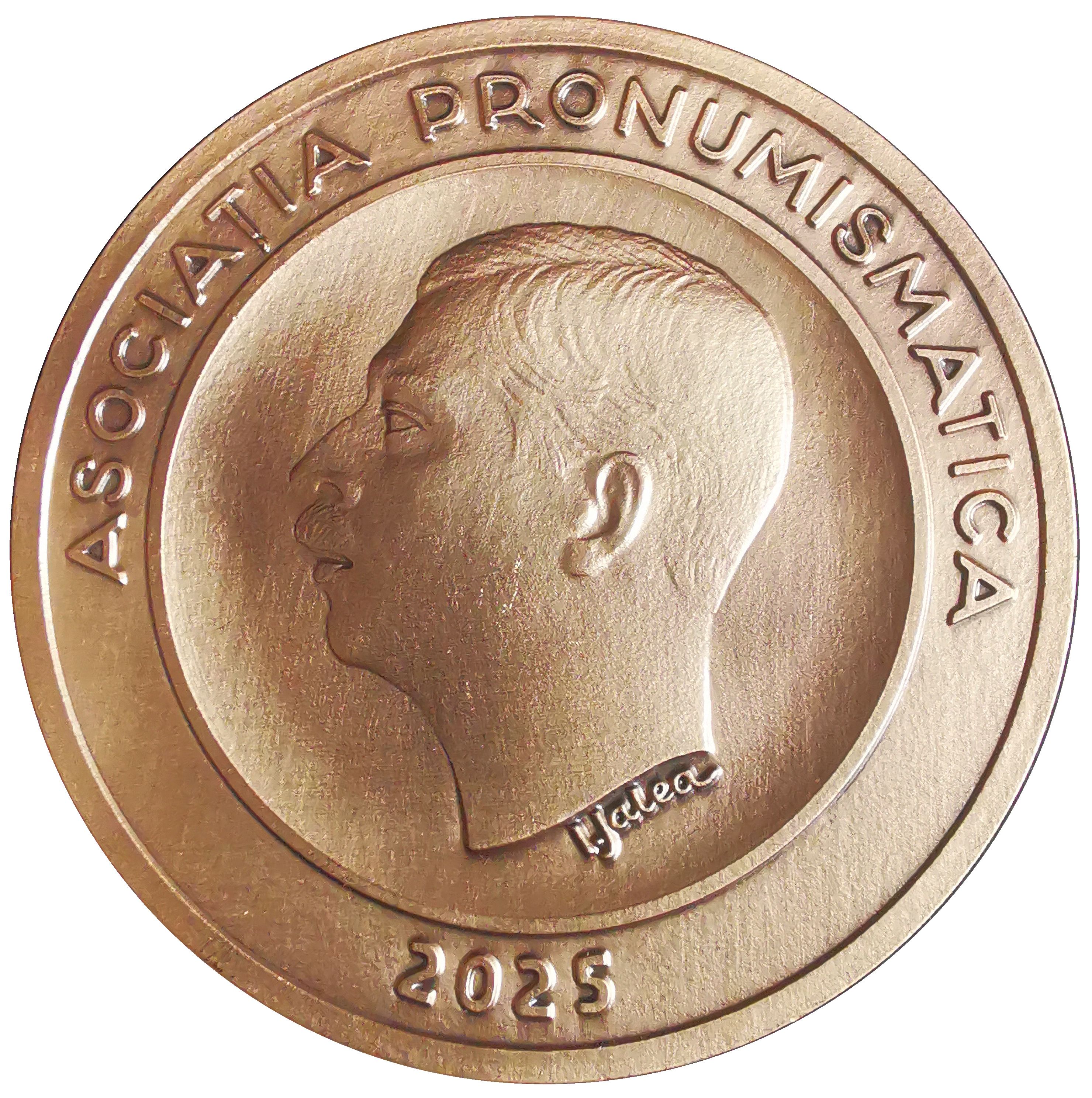 Опис: Погруддя короля Кароля II, звернене вліво, за мотивами портрета, використаного на монеті номіналом 200 леїв 1935 року — першому випуску, викарбуваному після відновлення роботи Державного монетного двору. Навколо напис ASOCIAȚIA PRONUMISMATICA, а нижче — дата 2025. Дизайн безпосередньо відсилає до нумізматичної моделі, пов’язаної з відродженням монетної справи.