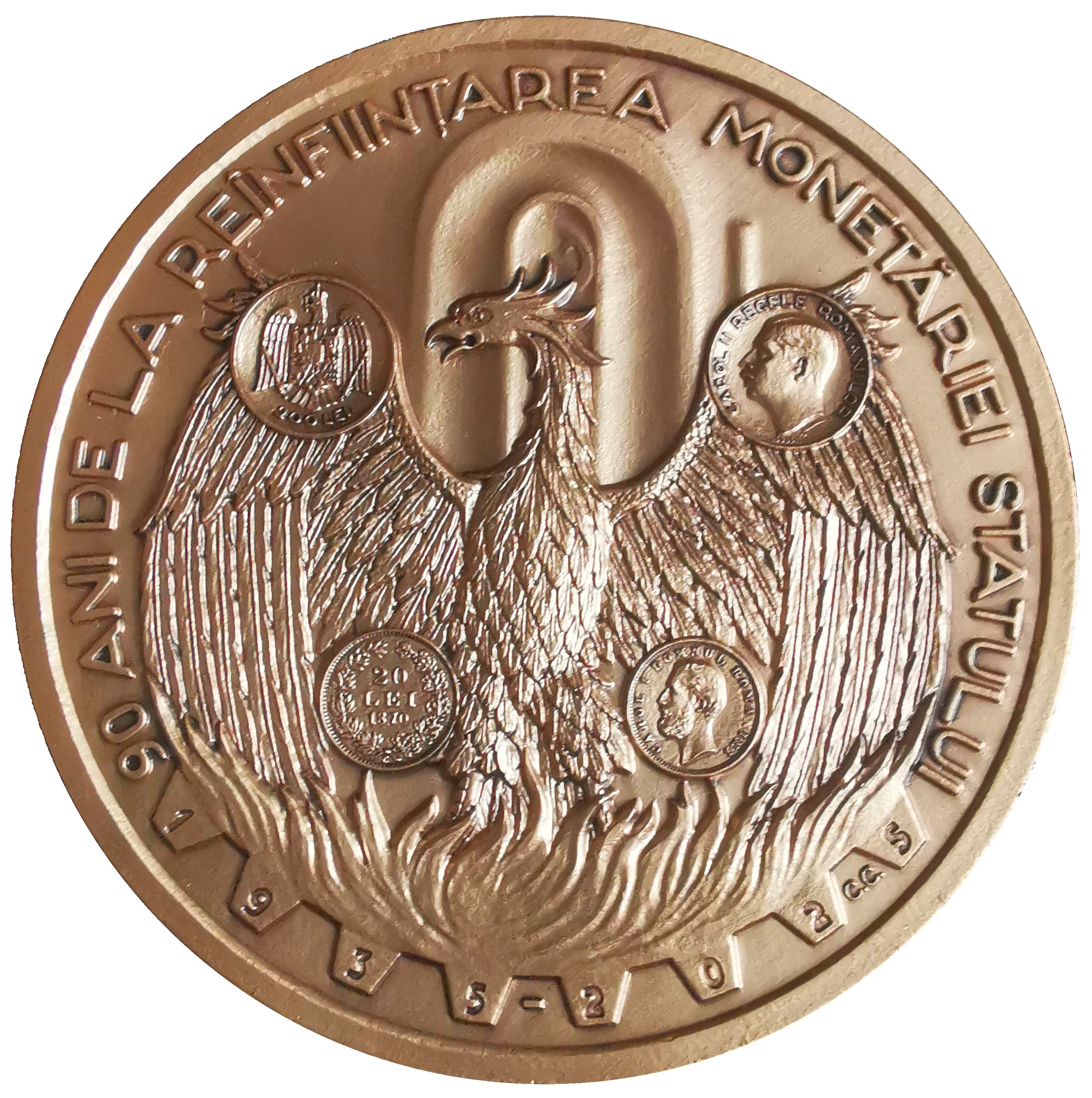 Опис: Фенікс, що піднімається перед монетним пресом, символізує відродження Державного монетного двору. На його крилах зображені монети номіналом 200 леїв 1935 року (вгорі) та 20 леїв 1870 року (внизу), кожна з яких показана з аверсом і реверсом, що позначає перші випуски відповідно відновленого та оригінального монетного двору. Нижче на частині зубчастого колеса зображено цифри 1935–2025, кожна з яких розміщена на окремому зубі, що підкреслює безперервність виробництва. Навколо — напис «90 ANI DE LA REÎNFIINȚAREA MONETĂRIEI STATULUI».