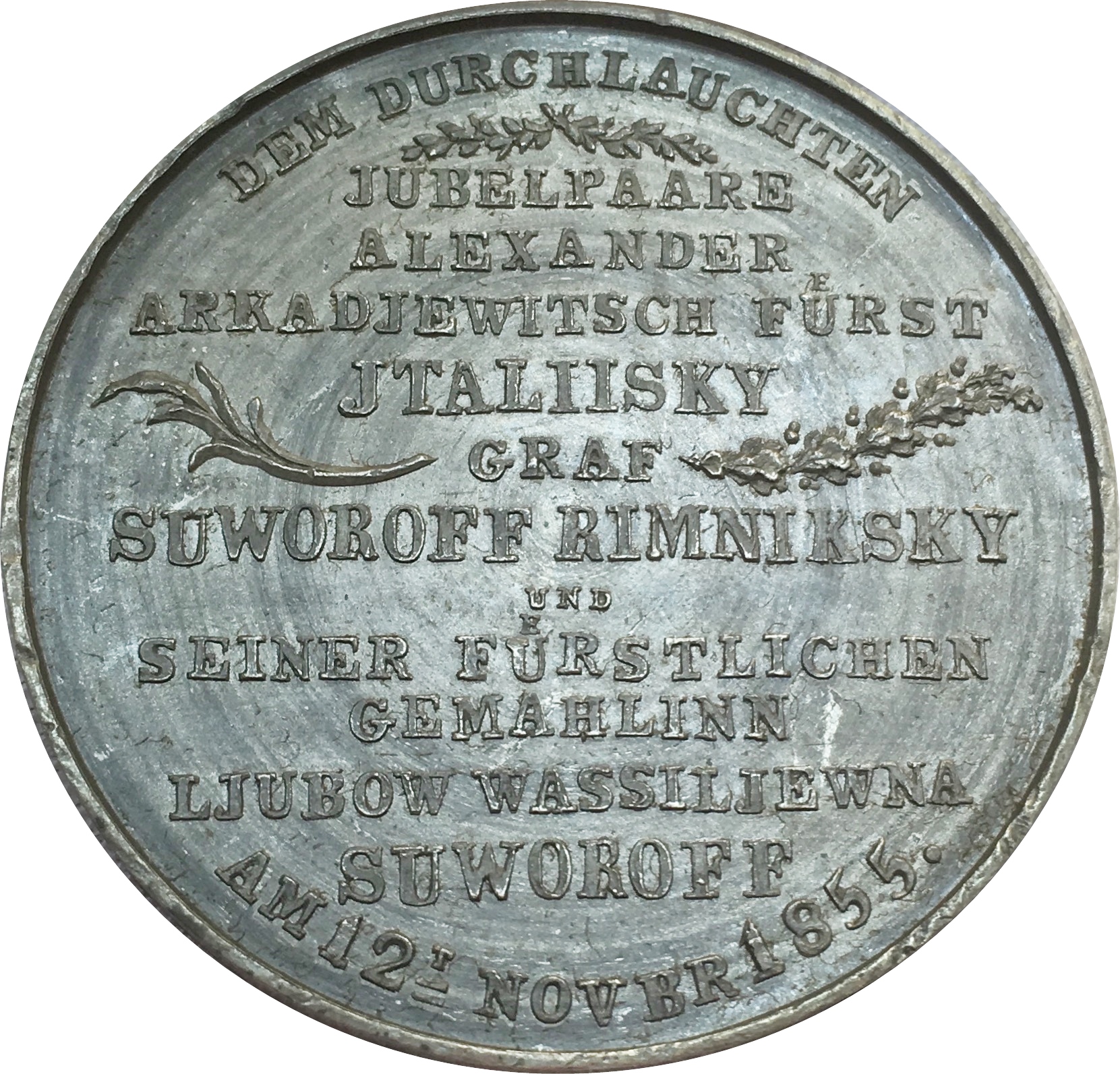 Опис: 13-рядковий напис з лавровими гілками зверху та пальмовими й дубовими гілками з боків.