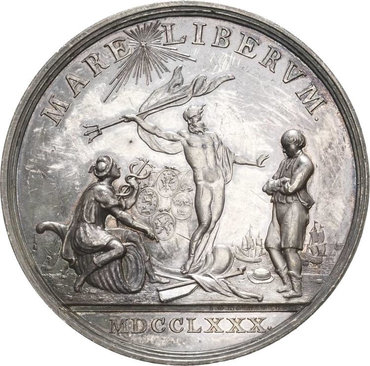 Опис: Нептун стоїть з тризубом на мушлі з щитами чотирьох договірних сторін, ліворуч Меркурій сидить на порожньому рогу достатку і вказує на весло та прапор, що лежать поруч, на які дивиться моряк.