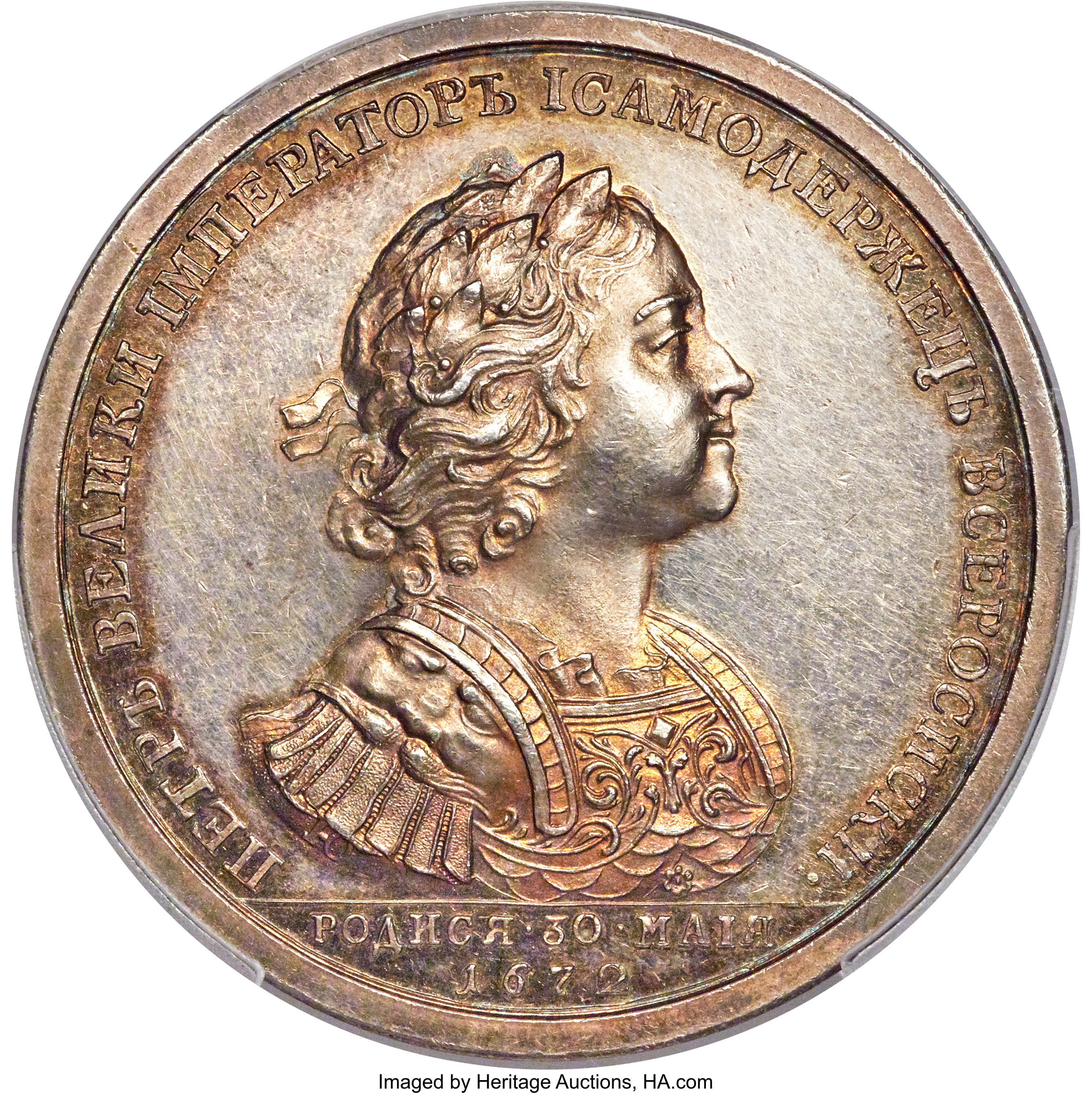 Опис: Лауреат, броньований і мантійний бюст імператора Петра I праворуч.