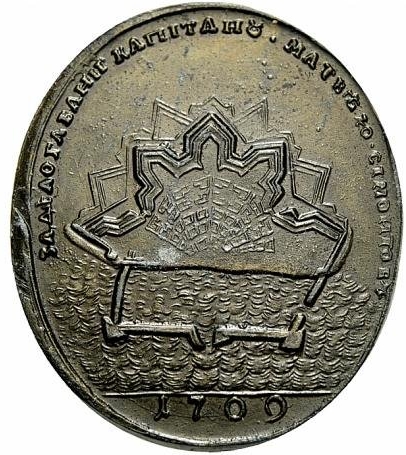 Медаль — Петро I (Нагорода капітану Матвію Симонтову за будівництво штучного гавані) 1709 – 1709 Російська імперія