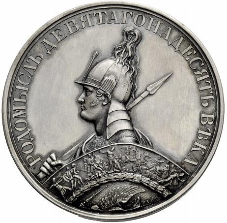 Опис: Бюст імператора Олександра I у шоломі, у вигляді слов'янського бога Родомисла, зі списом і оздобленим щитом ліворуч.