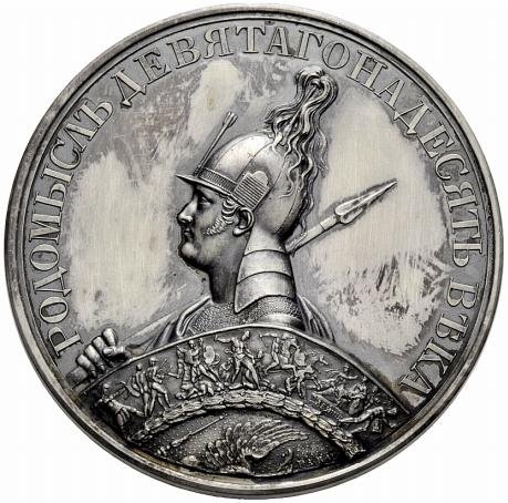 Опис: Бюст імператора Олександра I у шоломі, у вигляді слов'янського бога Родомисла, зі списом і оздобленим щитом ліворуч.
