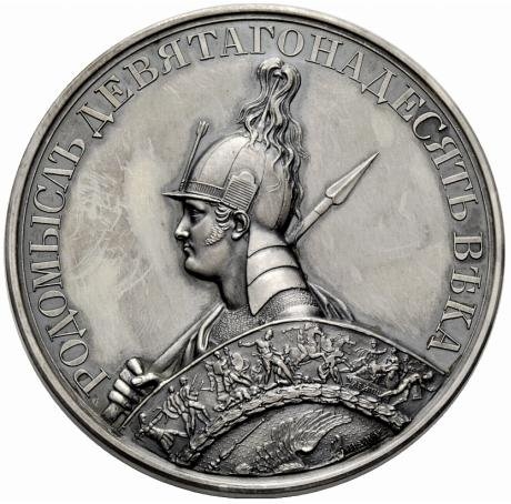 Опис: Бюст імператора Олександра I у шоломі, у вигляді слов'янського бога Родомисла, зі списом і оздобленим щитом ліворуч.
