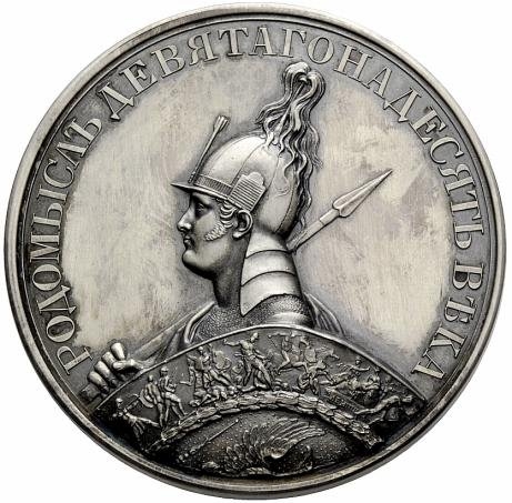 Опис: Бюст імператора Олександра I у шоломі, у вигляді слов'янського бога Родомисла, зі списом і оздобленим щитом ліворуч.