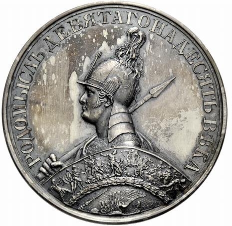 Опис: Бюст імператора Олександра I у шоломі, у вигляді слов'янського бога Родомисла, зі списом і оздобленим щитом ліворуч.