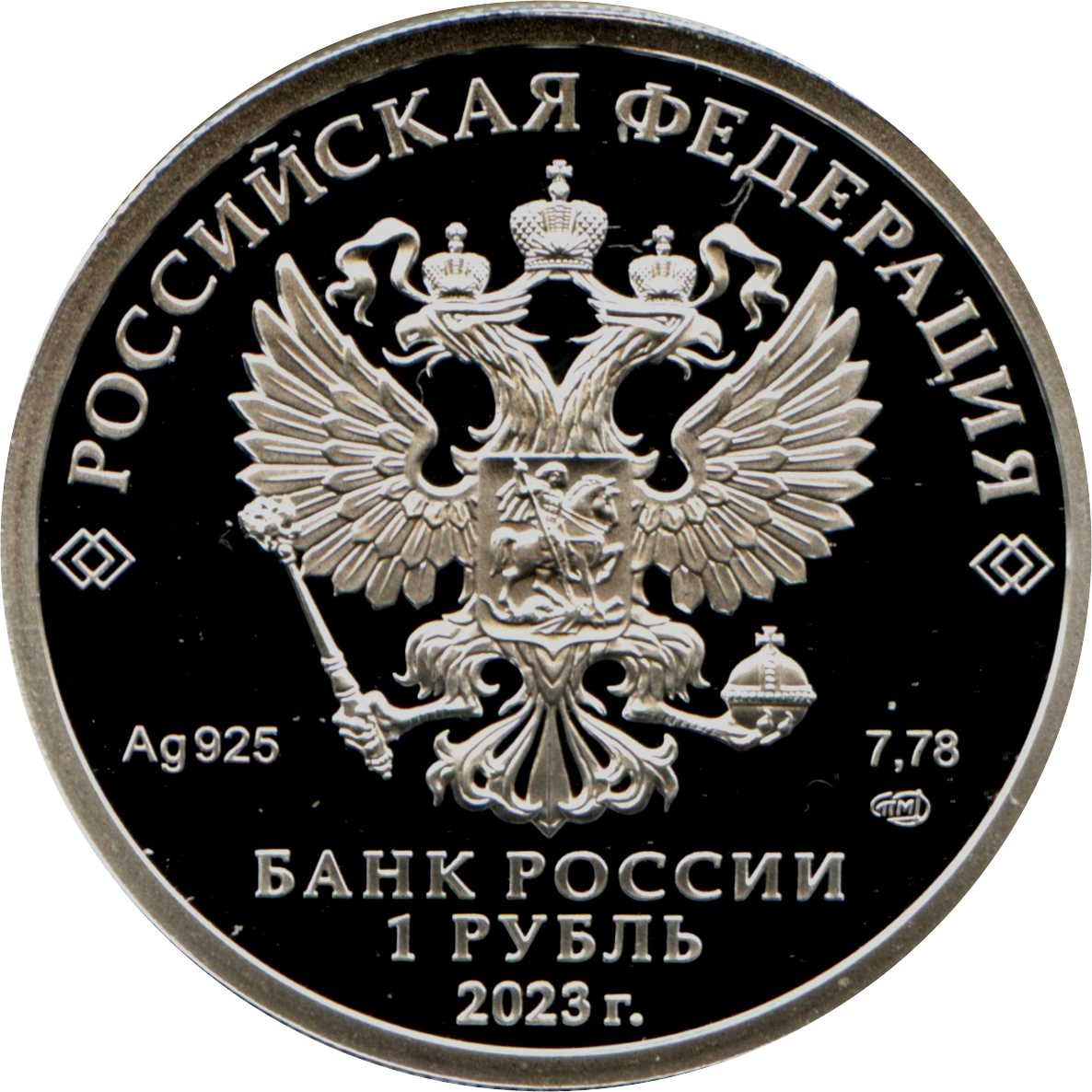 Опис: На дзеркальному полі диска зображено рельєфний герб Російської Федерації, над ним по колу розміщено напівкруглий напис «РОССИЙСКАЯ ФЕДЕРАЦИЯ» (РОСІЙСЬКА ФЕДЕРАЦІЯ), обрамлене з обох боків подвійними ромбами, нижче під гербом зліва вказано дорогоцінний метал і його пробу, а праворуч — вміст дорогоцінного металу та знак монетного двору, внизу по центру трьома рядками розміщено напис «БАНК РОССИИ» (БАНК РОСІЇ), номінал монети «1 РУБЛЬ» (1 РУБЛЬ) і рік випуску «2023 г.» (2023).