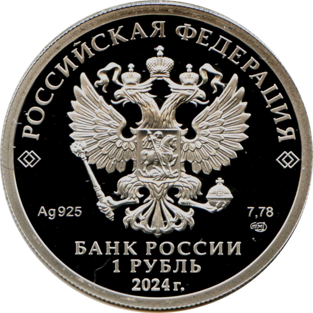 Опис: На аверсі монет зображено рельєфний герб Російської Федерації та написи «РОССИЙСКАЯ ФЕДЕРАЦИЯ» (РОСІЙСЬКА ФЕДЕРАЦІЯ) і «БАНК РОССИИ» (БАНК РОСІЇ), номінал монети «1 РУБЛЬ» (1 РУБЛЬ), рік випуску «2024 г.» (2024), хімічний символ металу відповідно до періодичної таблиці Менделєєва, проба, торговельна марка Санкт-Петербурзького монетного двору та вміст дорогоцінного металу.