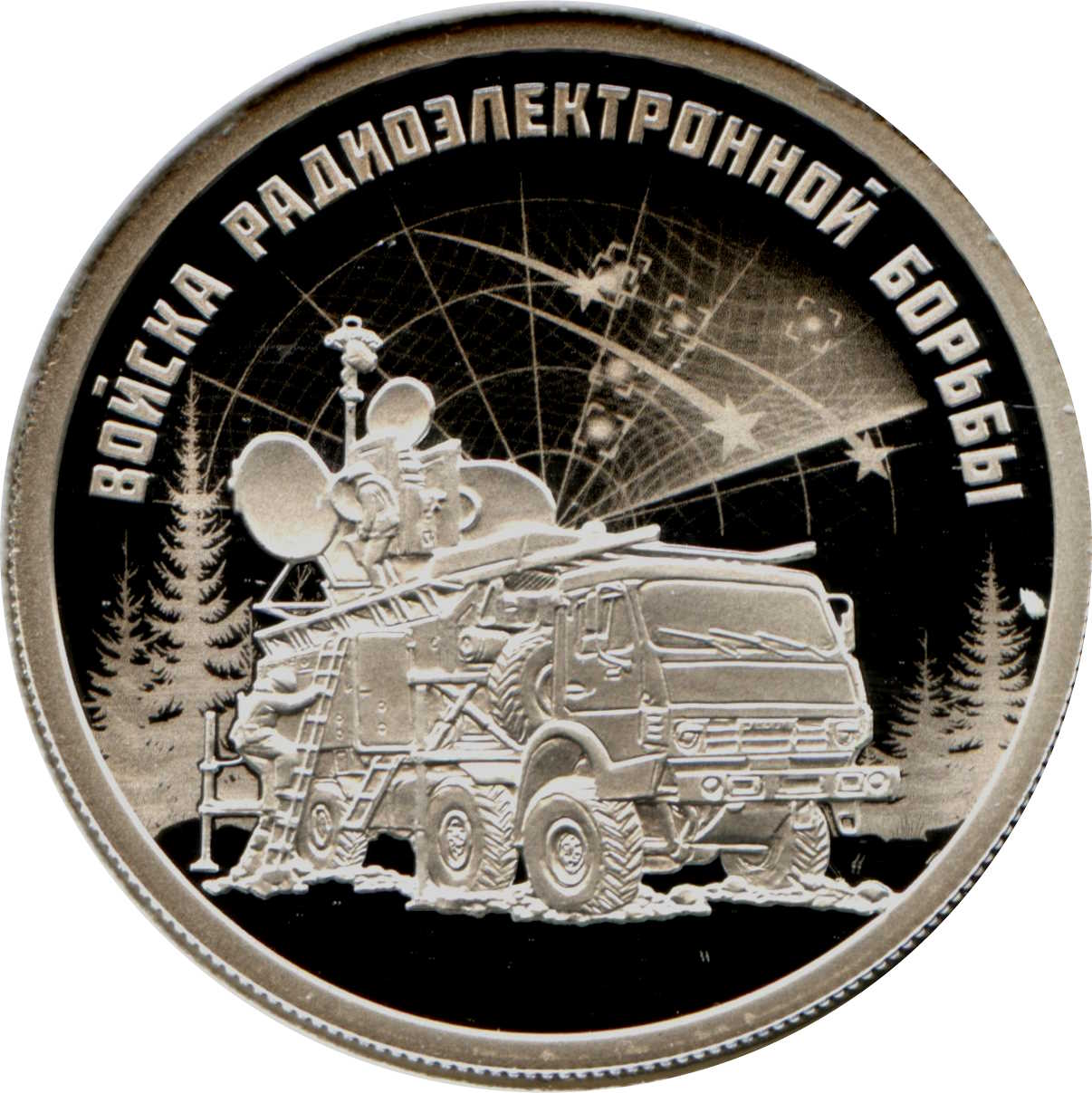 Опис: На дзеркальній поверхні диска зображено рельєфне зображення системи радіоелектронної боротьби «Красуха» на тлі лісу та частини екрану радара, обробленого лазером для матового покриття; по верхньому колу розміщено рельєфний напис «ВОЙСКА РАДИОЭЛЕКТРОННОЙ БОРЬБЫ» (ВІЙСЬКА РАДІОЕЛЕКТРОННОЇ БОРОТЬБИ).