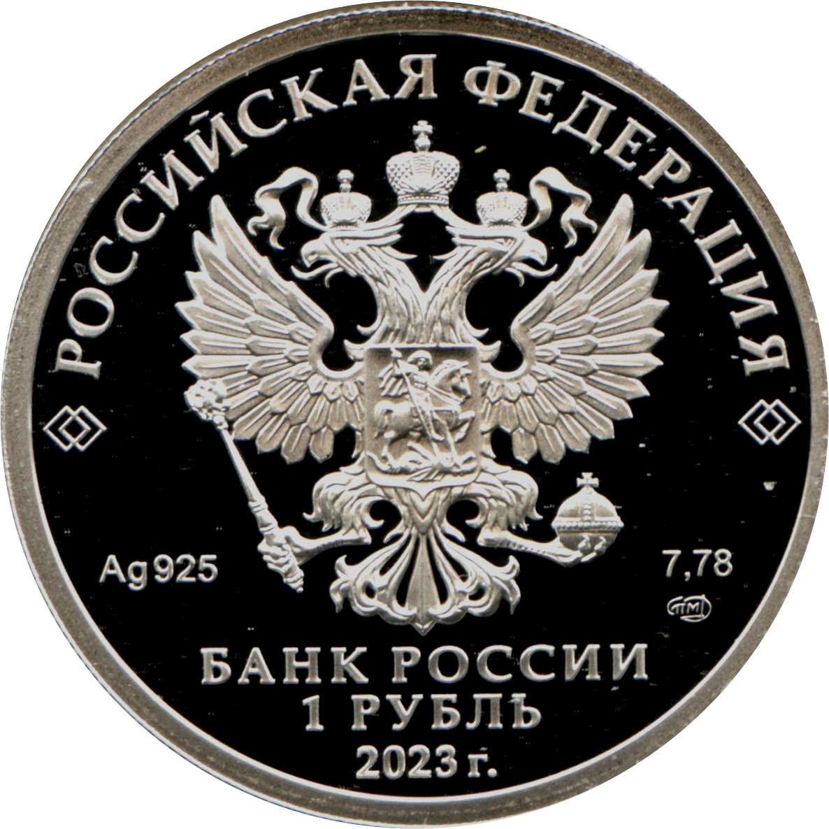 Опис: На дзеркальному полі диска зображено рельєфний герб Російської Федерації, над ним по колу розміщено напівкруглий напис «РОССИЙСКАЯ ФЕДЕРАЦИЯ» (РОСІЙСЬКА ФЕДЕРАЦІЯ), обрамлене з обох боків подвійними ромбами, нижче під гербом зліва вказано дорогоцінний метал і його пробу, а праворуч — вміст дорогоцінного металу та знак монетного двору, внизу по центру трьома рядками розміщено напис «БАНК РОССИИ» (БАНК РОСІЇ), номінал монети «1 РУБЛЬ» (1 РУБЛЬ) і рік випуску «2023 г.» (2023).