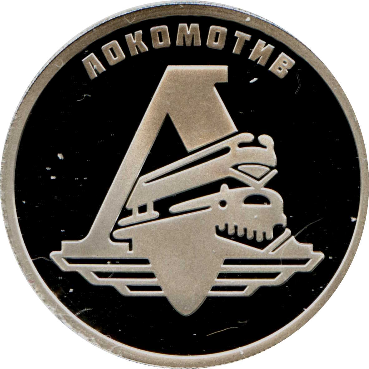 Опис: На реверсі монети зображено рельєфний герб спортивного товариства «Локомотив» та рельєфний напис «ЛОКОМОТИВ» по верхньому колу.