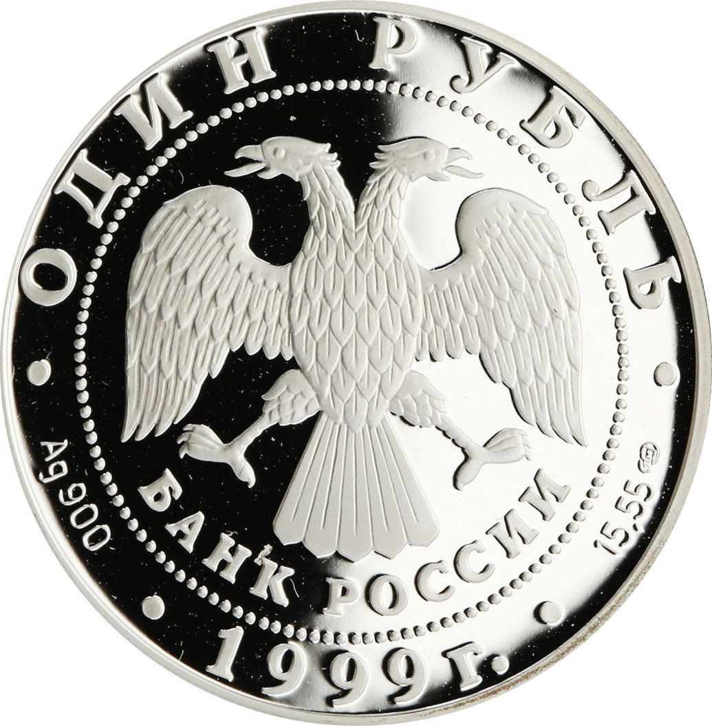 Опис: У центрі — емблема Банку Росії (двоголовий орел, створений І. Білібіним, нижче — напівкругла напис — «БАНК РОССИИ» (БАНК РОСІЇ), обрамлена колом з крапок і написів по краю: зверху — «ОДИН РУБЛЬ» (ОДИН РУБЛЬ), внизу — «1999», літери ліворуч позначають метал і пробу, праворуч — вміст дорогоцінного металу і знак монетного двору.