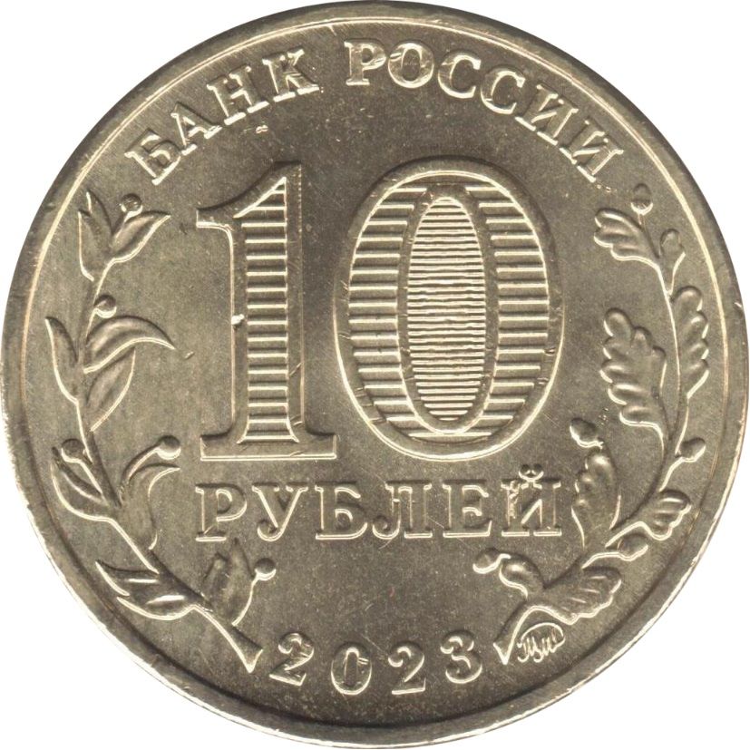 Опис: У центрі номінал монети «10 РУБЛЕЙ» (10 РУБЛІВ), всередині цифри «0» приховані зображення цифри «10» та напис «РУБ» (RUB), які по черзі стають видимими при зміні кута зору, зліва та справа стилізовані зображення лаврової та дубової гілок відповідно, по краю зверху напис «БАНК РОССИИ» (БАНК РОСІЇ), внизу – рік випуску «2023», праворуч від нього – знак монетного двору.