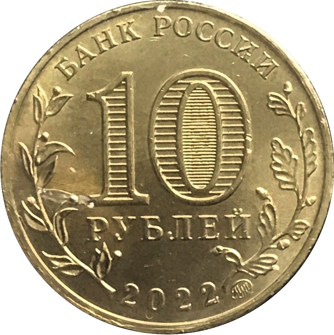 Опис: На аверсі монети по колу розміщені написи: «БАНК РОССИИ» (БАНК РОСІЇ) у верхній частині та «2022» у нижній частині. Зліва та справа зображені гілки лавра та дуба відповідно. У центрі розміщено цифру «10» та напис «РУБЛЕЙ» (РУБЛІ), що позначають номінальну вартість монети. У цифрі «0» розміщено захисний елемент у вигляді цифри «10» та напису «РУБ» (RUB), який видно під різними кутами огляду поверхні монети. У нижній частині розміщено логотип Московського монетного двору.