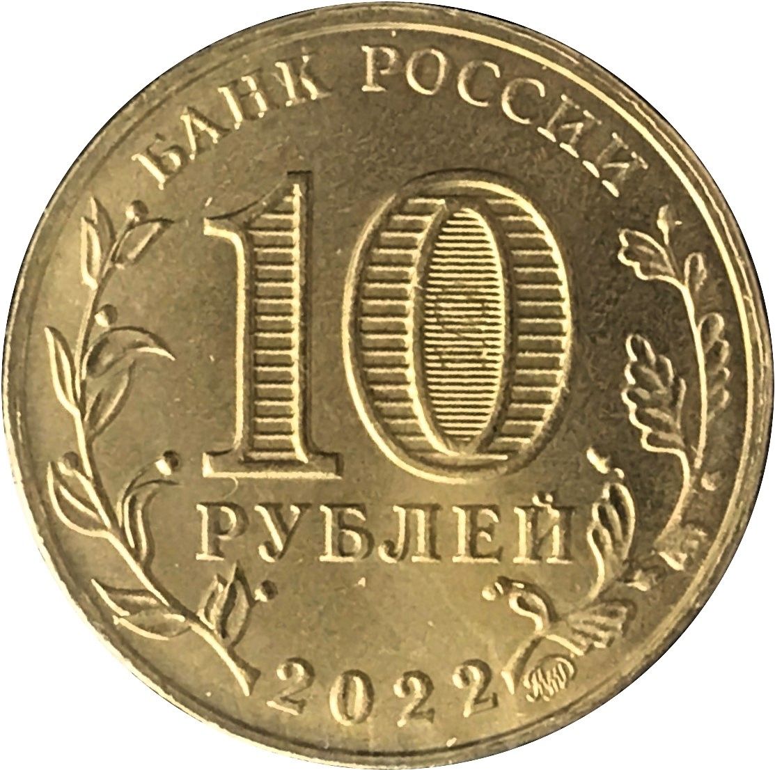 Опис: На аверсі монети по колу розміщені написи: «БАНК РОССИИ» (БАНК РОСІЇ) у верхній частині та «2022» у нижній частині. Зліва та справа розміщені зображення гілок лавра та дуба відповідно. У центрі розміщено цифру «10» та напис «РУБЛЕЙ» (РУБЛІ), що позначають номінальну вартість монети. У цифрі «0» розміщено захисний елемент у вигляді цифри «10» та напису «РУБ» (RUB), який видно під різними кутами огляду поверхні монети. У нижній частині розміщено логотип Московського монетного двору.