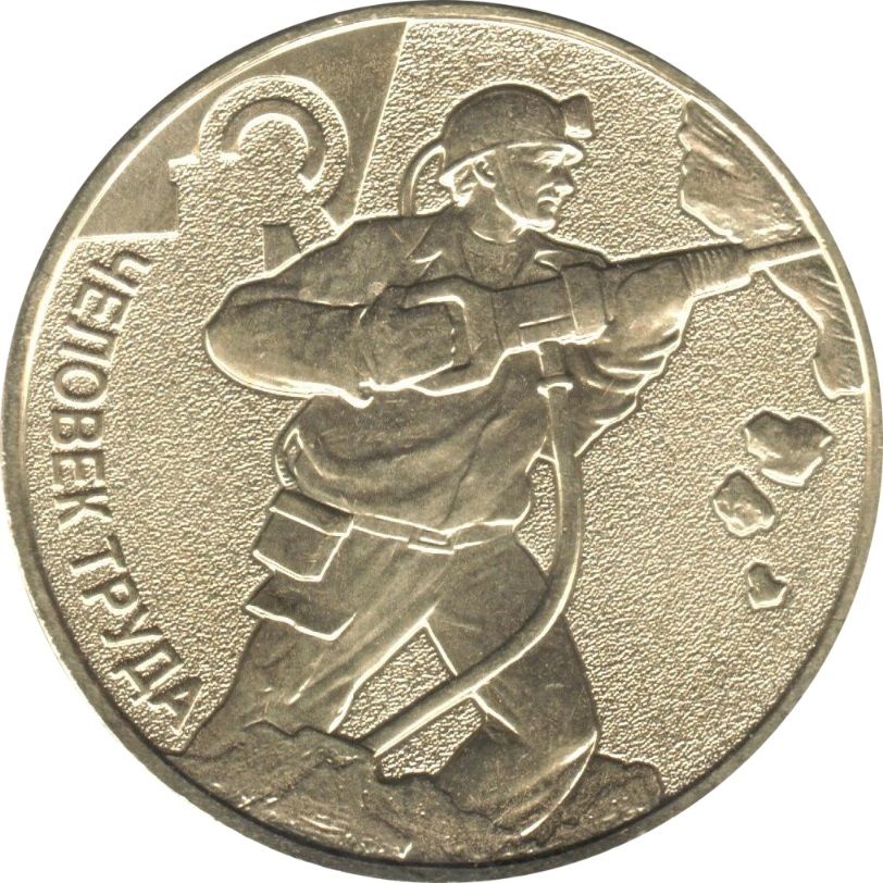 Опис: На зворотному боці монети зображено рельєфне зображення шахтаря, який тримає буровий інструмент, стилізоване зображення елемента шахтного підйомника та напис по колу «ЧЕЛОВЕК ТРУДА» (ЛЮДИНА ПРАЦІ).