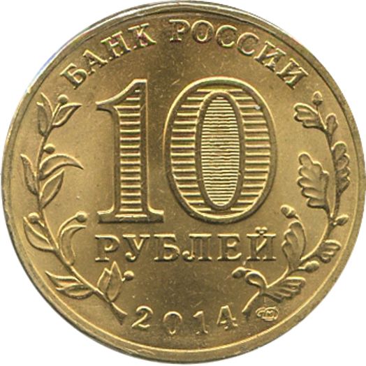 Опис: У верхній частині монети вздовж краю розміщено напис: «БАНК РОССИИ» (БАНК РОСІЇ), у нижній частині — рік випуску «2014». Зліва та справа розміщено стилізовані зображення лаврового дерева та дубових гілок відповідно. У центрі диска двома рядками вказано номінал монети «10 РУБЛЕЙ» (10 РУБЛІВ). Усередині цифри «0» розташований захисний елемент у вигляді цифри «10» і напис «РУБ» (RUB), які по черзі стають видимими при зміні кута зору. У нижній частині диска розміщений знак монетного двору.