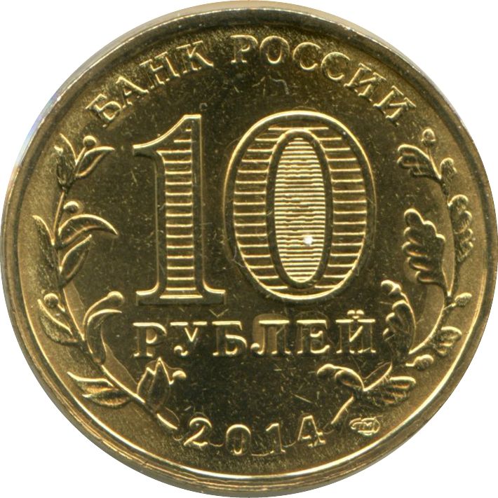Опис: Номінал у центрі: «10 РУБЛІВ». Голографічні зображення «10» і «РУБ» всередині цифри «0» номіналу. Гілка оливи ліворуч, гілка дуба — праворуч. Написи: «БАНК РОСІЇ» зверху, дата «2014» знизу.