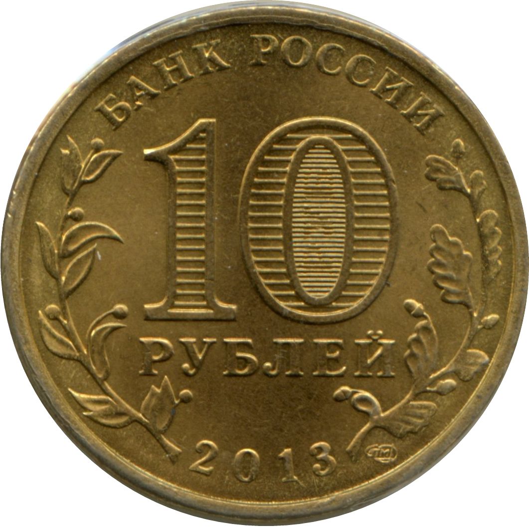 Опис: У центрі диска — позначення номінальної вартості монети «10 РУБЛЕЙ» (10 РУБЛІВ). Усередині цифри «0» — приховані зображення цифри «10» та напису «РУБ» (RUB), які по черзі стають видимими при зміні кута зору. По краю - кругові написи, зверху: «БАНК РОССИИ» (БАНК РОСІЇ), знизу - дата: «2013», ліворуч - стилізоване зображення оливкової гілки, праворуч - дубової.