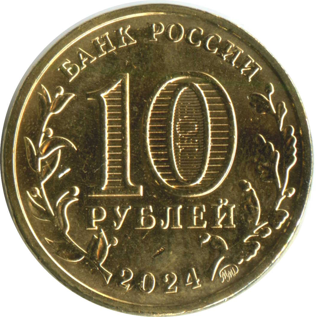 Опис: У центрі номінал монети «10 РУБЛЕЙ» (10 РУБЛІВ), всередині цифри «0» приховані зображення цифри «10» та напис «РУБ» (RUB), які видно по черзі при зміні кута зору, зліва та справа стилізовані зображення лаврових та дубових гілок відповідно, по краю зверху напис «БАНК РОССИИ» (БАНК РОСІЇ), внизу – рік випуску «2024», праворуч від нього – знак монетного двору.