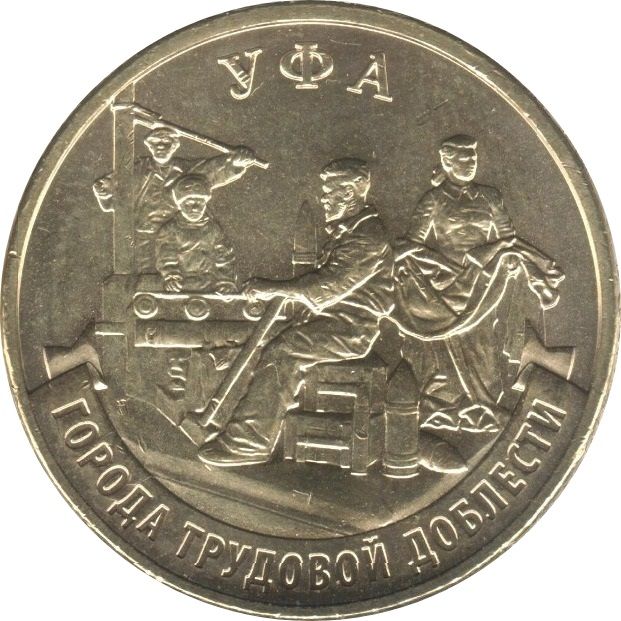 Опис: На реверсі монети зображено рельєфний фрагмент пам'ятника трудівникам тилу та написи по колу: «УФА» (УФА) у верхній частині та «ГОРОДА ТРУДОВОЙ ДОБЛЕСТИ» (МІСТА ТРУДОВОЇ ДОБЛЕСТІ) у нижній частині вздовж стрічки.