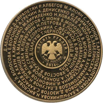 Опис: У центрі диска, в колі, утвореному суцільною концентричною лінією, — емблема Банку Росії [двоголовий орел з опущеними крилами, під ним — напівкруглий напис «БАНК РОССИИ» (БАНК РОСІЇ)], обрамлена колом з крапок і написів по краю — зверху: «ДЕСЯТЬ РУБЛЕЙ» (ДЕСЯТЬ РУБЛІВ), внизу: в центрі – рік випуску «2014 г.» (2014), праворуч – знак монетного двору, на полі навколо емблеми – імена 47 російських спортсменів – бронзових призерів Лондонської Олімпіади, розташовані по спіралі.