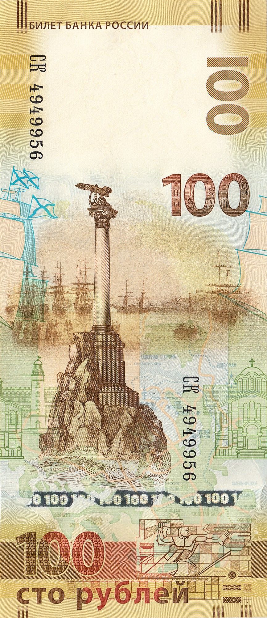 план міста Севастополь «Меморіал героїчній обороні Севастополя в 1941-1942 роках», площа Нахімова (І. Фялко та В. Яковлєв) Собор Святого Володимира Захисна нитка з цифрою «100», розташована горизонтально внизу банкноти.