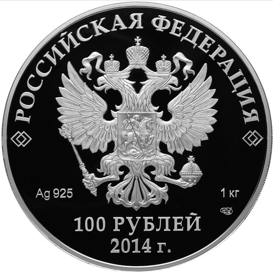 Опис: На дзеркальному полі диска — рельєфне зображення Державного герба Російської Федерації, над ним — напівкругла напис по колу: «РОССИЙСКАЯ ФЕДЕРАЦИЯ» (РОСІЙСЬКА ФЕДЕРАЦІЯ), нижче під гербом: ліворуч — позначення металу за періодичною системою елементів Д.І. Менделєєва та його чистота, праворуч у два рядки — позначення вмісту дорогоцінного металу та знак монетного двору, внизу по центру у два рядки — номінал монети: «100 РУБЛЕЙ» (100 РУБЛІВ) і дата: «2014 г.» (2014).