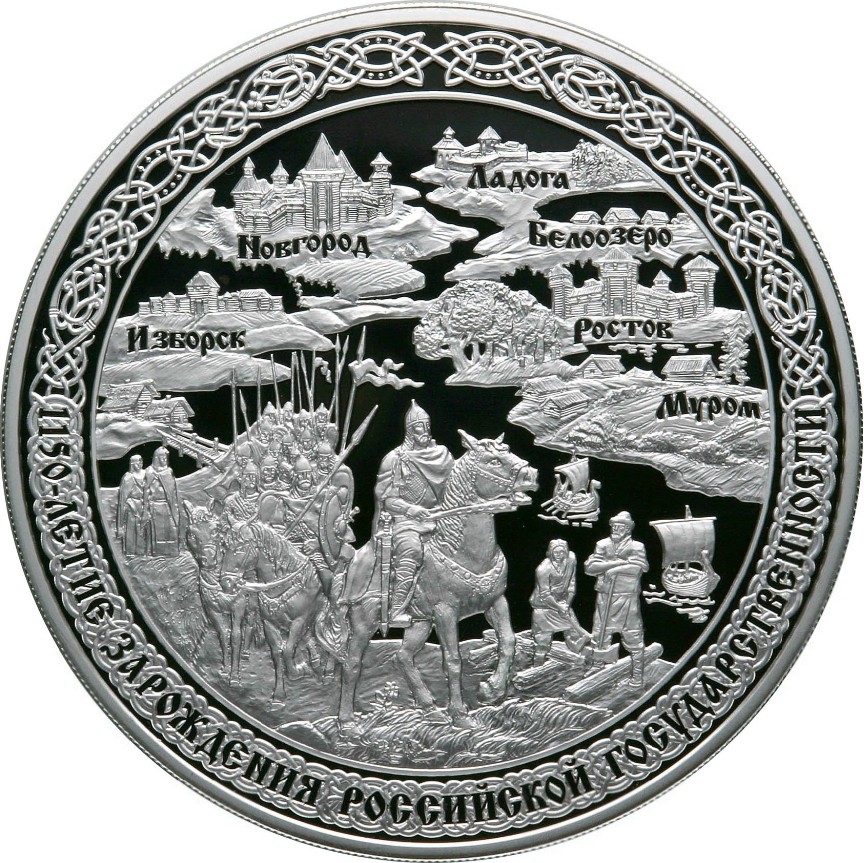 Опис: На передньому плані — загін озброєних вершників, що рухається вздовж великої річки, на задньому плані на берегах річки — стилізовані зображення давньоруських міст з назвами: «Изборск» (Ізборськ), «Новгород» (Новгород), «Ладога» (Ладога), «Белоозеро» (Білоозеро), «Ростов» (Ростов), «Муром» (Муром); на широкій смузі, утвореній обідком і концентричною лінією кола, - напис, що йде зліва вниз і вправо: «1150-ЛЕТИЕ ЗАРОЖДЕНИЯ РОССИЙСКОЙ ГОСУДАРСТВЕННОСТИ» (1150-РІЧЧЯ ЗАРОДЖЕННЯ РОСІЙСЬКОЇ ДЕРЖАВНОСТІ), у верхній частині смуги — орнаменти з хвилястих ліній.